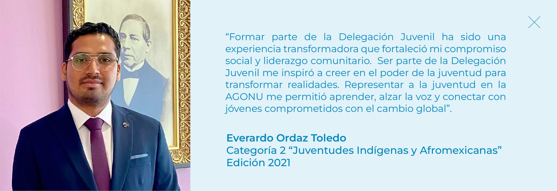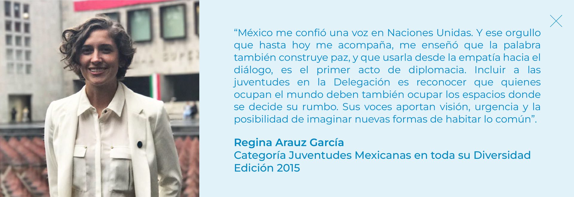 El Secretario General de la ONU, António Guterres, nos ha recordado que: “cuando la juventud lidera, la sociedad prospera”. Los testimonios que se presentan en esta publicación lo confirman. Así lo expresa Regina Auraz, quien representó a México durante el 70 aniversario de la ONU: “México me confió una voz en Naciones Unidas. Ese orgullo me enseñó que la palabra también construye paz, y que usarla desde la empatía hacia el diálogo es el primer acto de diplomacia”. Y como afirma Kenia Calva, exdelegada juvenil: “Como indígena, aprendí que nuestra voz es esencial. Aunque venimos de realidades distintas, compartimos la misma lucha: construir un mundo más justo”.