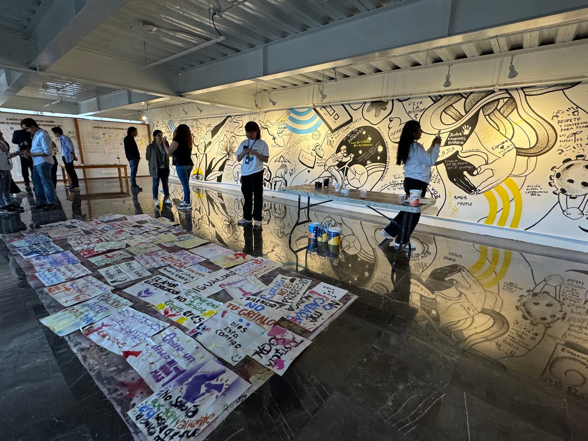 Juventudes mexicanas que participaron en el evento Ecos del Futuro posan en la Plaza de las Tres Culturas, en Tlatelolco, Ciudad de México, en memoria de las y los estudiantes asesinados en este mismo lugar el 2 de octubre de 1968 (der). Arriba, actividades de micrófono abierto, mural y grabado en el evento Ecos del Futuro, septiembre 2024.