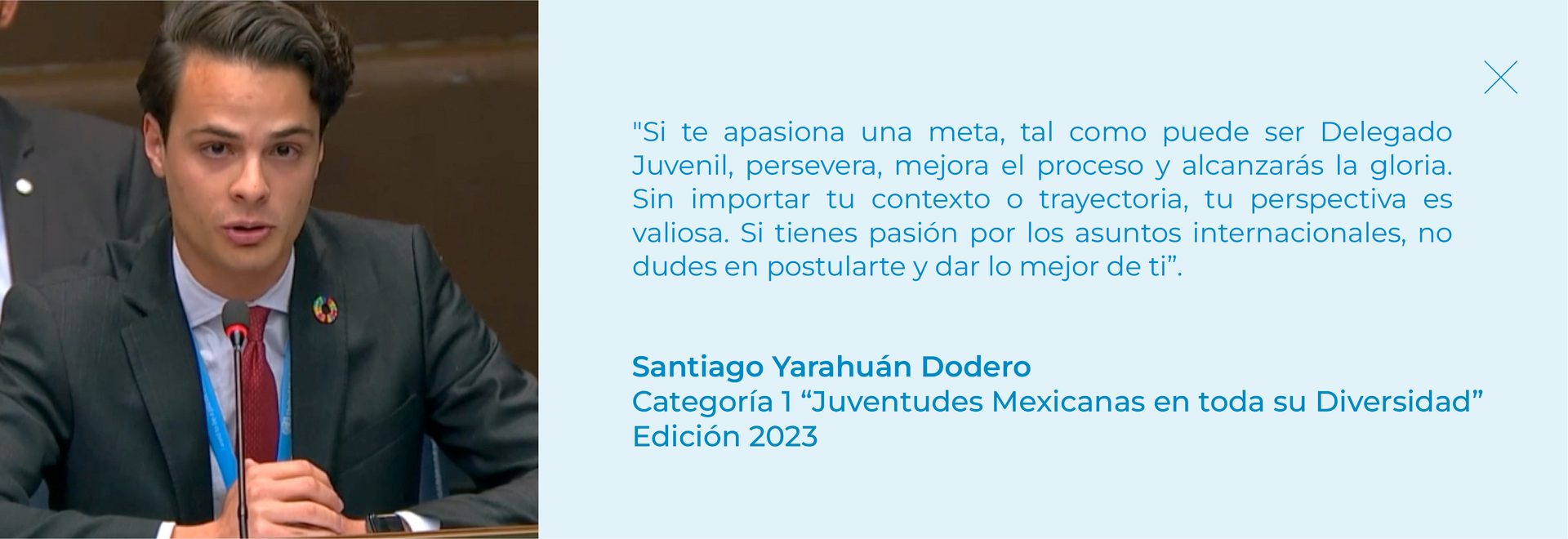 “México reconoce el potencial transformador de las juventudes y reitera su firme determinación de incorporar sus voces y sus perspectivas en la agenda internacional. Por ello, el Programa ‘Delegación Juvenil en la Asamblea General de la Organización de las Naciones Unidas’ constituye una iniciativa emblemática del Estado Mexicano y pionera en el Sur Global”