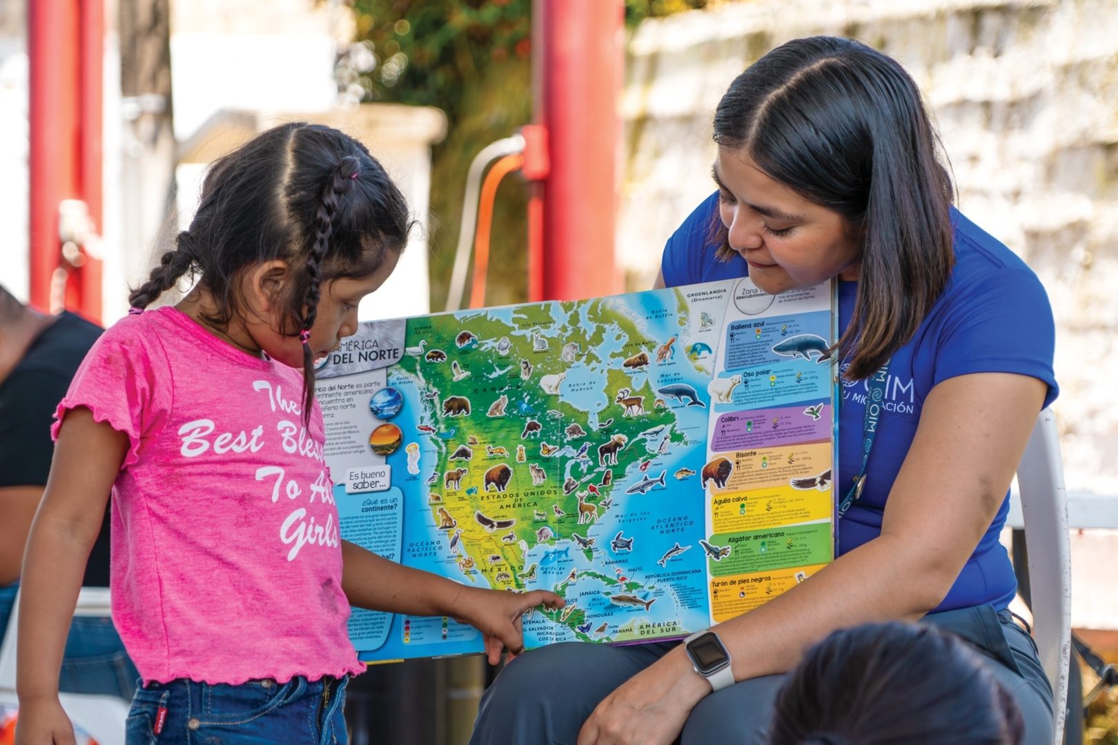 Desde 2018 más de tres millones de personas migraron a través de México solas, en familia o en grandes grupos. Mujeres, niñas, personas enfermas presentaron condiciones de vulnerabilidad. La Organización Internacional para las Migraciones (OIM/ONU Migración) las asistió y protegió en las rutas, ayudó a que conocieran sus derechos, y a que exploraran modos de integrarse en México. En la imagen una niña señala a la trabajadora humanitaria de OIM dónde está su casa durante una jornada de identidad legal celebrada en El Edén, Chiapas.